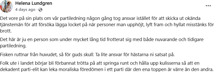 Samma dag, under helgen, och idag på morgonen skriver Helena Lundgren ett antal inlägg på Facebook där hon går till stark kritik mot partiledningen i Stockholm för hur den hanterat denna och liknande skandaler.