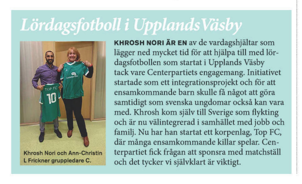 Fotbollslaget startades i Upplands Väsby under 2016, och riktade sig till så kallade ensamkommande barn från Afghanistan. Centerpartiet var engagerat i projektet och var även ”sjävklar” sponsor av företagets matchställ.
