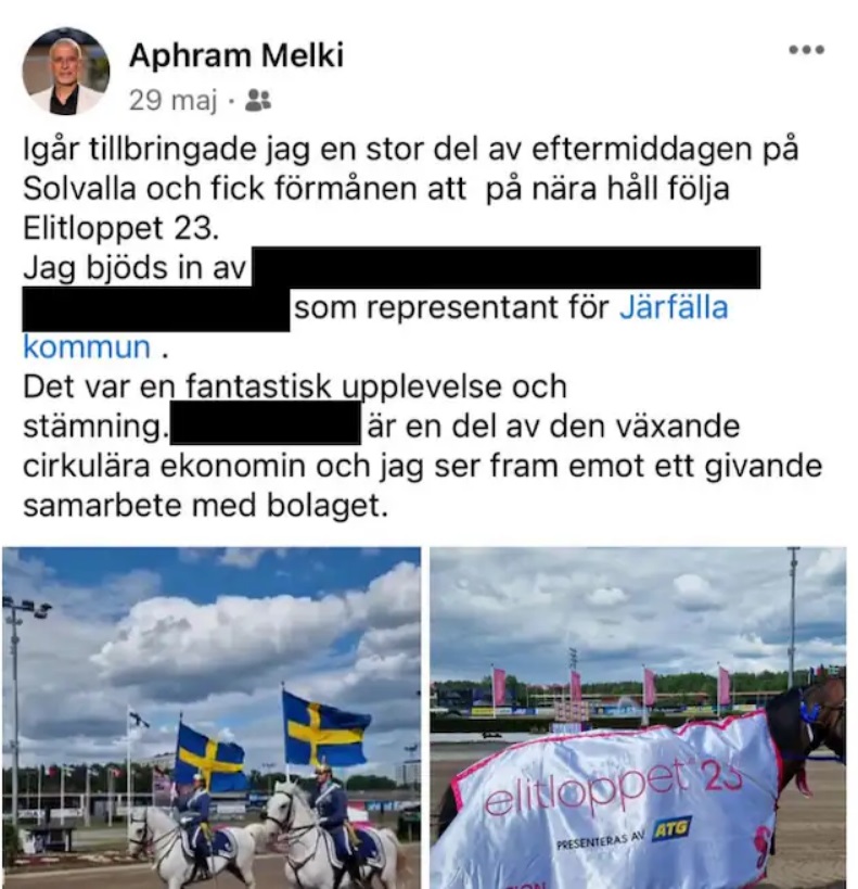 Melki berättar för Expressen att han inte har gjort något fel utan enbart besökte Solvallas elitlopp eftersom att han skulle närvara på ”en föreläsning om miljöarbete”. Bakom föreläsningen stod ett bolag som kommunen har en affärsmässig relation med.