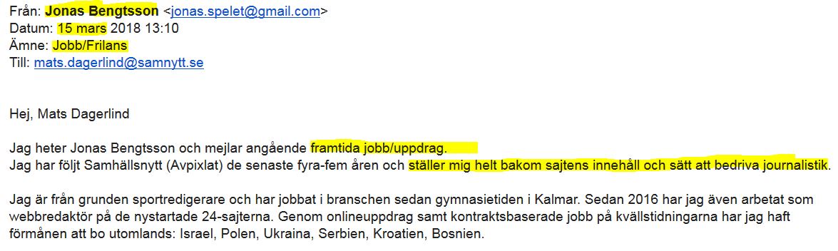 Problemet med beskrivningen är att den – som så mycket annat i Fricks journalistik – inte stämmer. Jonas Bengtsson kontaktade Samhällsnytt på eget initiativ den 15 mars, alltså en månad innan den ovan beskrivna konversationen ägt rum: