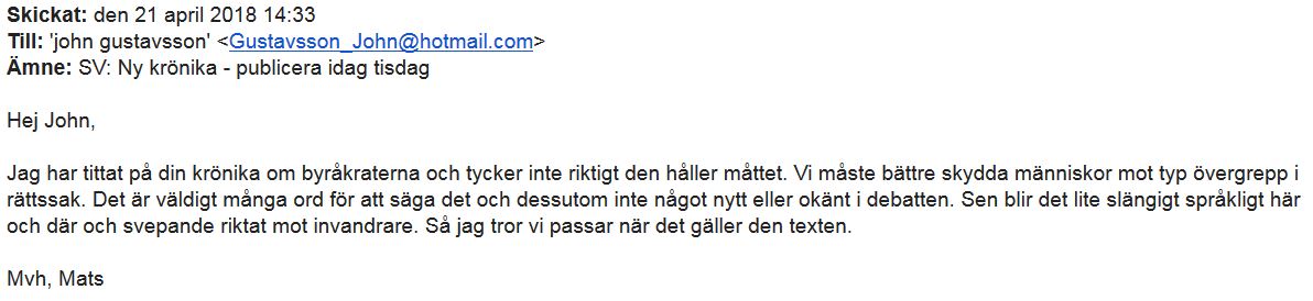 En annan person som citeras i Fricks artikel är före detta krönikören John Gustavsson. Redaktionen kämpade under en lång tid för att höja kvalitet på hans krönikor – vilket inte var någon lätt uppgift: banala idéer lades fram på ett onödigt komplicerat kvasi-akademiskt sätt i ett försök att ge mer legitimitet till fenomenet ”krönikör John Gustavsson”. Tills slut började Mats Dagerlind som arbetat med krönikor att refusera hans texter. Så här kommenterar han en av Gustavssons sista krönikor som inte publicerats: