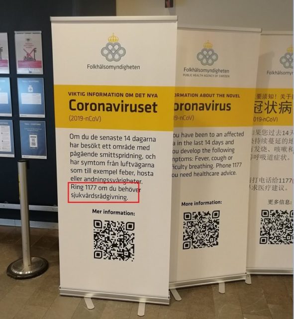 På fredagen uppmanade 1177 Vårdguiden oroliga invånare att sluta ringa deras telefontjänst ”i onödan” eftersom man inte har kapacitet att hantera samtalen. Uppmaningen står i kontrast till att Folkhälsomyndigheten – som enda insats på Arlanda flygplats norr om Stockholm – har satt upp en informationsskylt om att man ska ringa just 1177 vid misstanke.