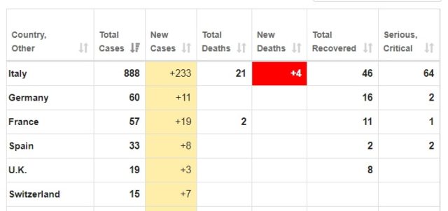 Samtidigt kommer fler rapporter från övriga Europa som visar att smittan fortsätter att växa. I Italien har man bekräftat 233 nya fall. Av landets hittills totalt 888 fall uppges 64 personer befinna sig i kritiskt tillstånd och 21 personer har så här långt avlidit till följd av viruset.