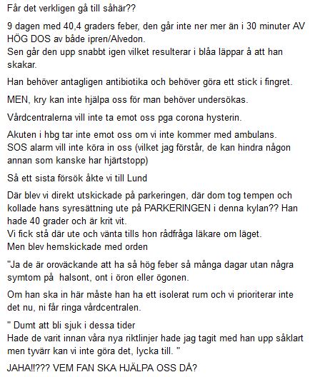 Sabina Lundström från Landskrona har kämpat med sjukvården i nio dagar för att få vård för sin 2-åriga son. När hon slutligen kom till barnakuten i Lund undersöktes pojken utomhus på en parkering och skickades hem med orden: ”Dumt att bli sjuk i dessa tider. Hade det varit innan våra nya riktlinjer hade jag tagit med han upp såklart men tyvärr kan vi inte göra det. Lycka till.”