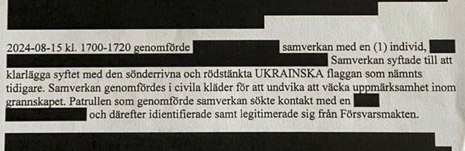 ”Samverkan syftade till att klarlägga syftet med den sönderrivna och rödstänkta UKRAINSKA flaggan som nämnts tidigare. Samverkan genomfördes i civila kläder för att undvika att väcka uppmärksamhet inom grannskapet”, står att läsa i rapporten.