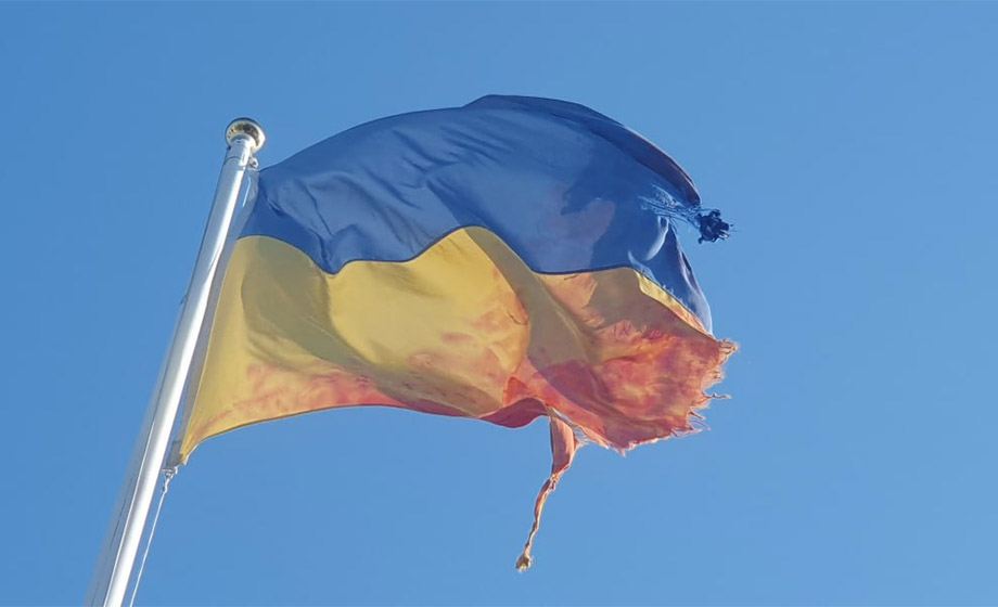 Dan Drakenholt förklarar att hans ukrainska flagga blåst sönder, och att han då fick idén att stänka röd färg på den som ett politiskt ställningstagande. Att det är många som dör i kriget.