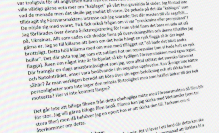 ”Jag förfärades över denna åsiktsregistrering”, står att läsa i hans anmälan där han även påpekar att om han istället valt att hissa en rysk flagga, så hade det inte varit olagligt.