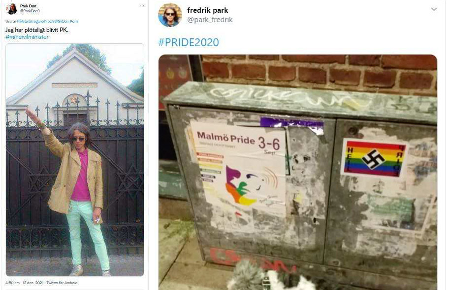 Bland annat lade Dan Park i december 2021 upp en bild på sig själv på Twitter där han hälsar med utsträckt arm framför judiska begravningsplatsen i Malmö. Bilden har försetts med hashtaggen #mincivilminister.