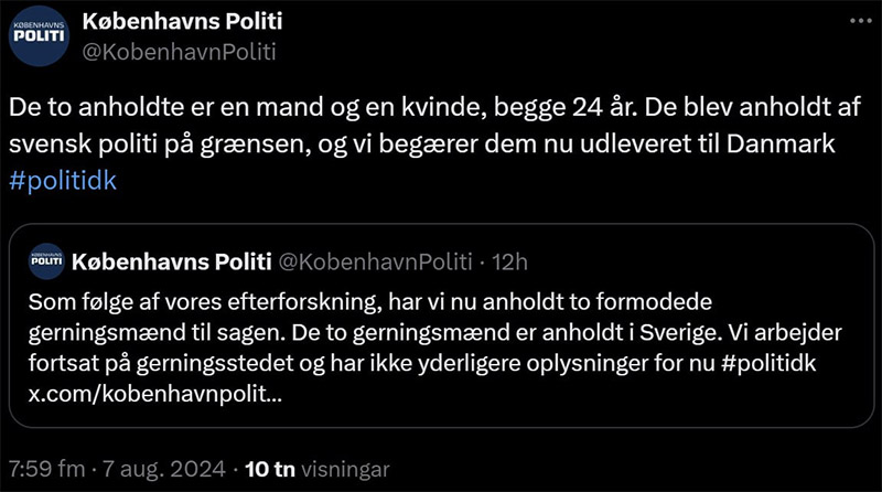 Och mycket riktigt. Bara timmar senare grips två misstänkta gärningsmän, en man och kvinna som båda är 24 år, av svensk polis vid gränsen till Sverige.