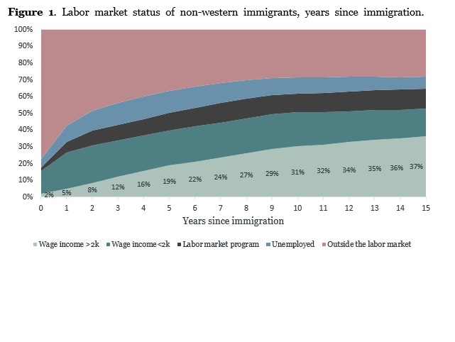 24nyt.dk citerar en rapport från Handelns Forskningsinstitut enligt vilken endast 37 procent av invandrarna arbetar för en lön som överstiger 20 tusen kronor per månad efter 15 år i Sverige. Resten försörjs helt eller delvis av skattebetalare.