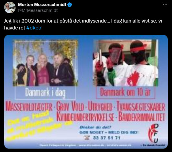 I oktober förra året, mer än 20 år efter rasismdomen vunnit laga kraft, postar Messerschmidt, som hunnit bli partiledare för Dansk folkeparti, återigen valaffischen från 2001 på sitt X-konto.