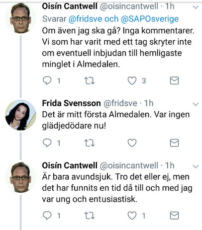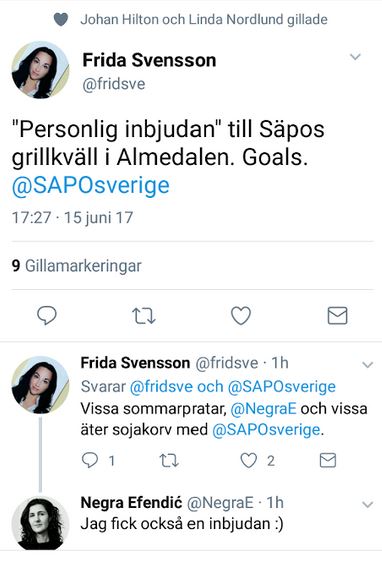 Den högsta hedersutmärkelsen för en riktig svensk journalist är att bli inbjuden till ett hemligt mingel med Säpo i Almedalen. För inte så länge sedan skröt man t o m om sådant på Twitter för att höja sin status bland kollegor. Notera att en av de inbjudna är Negra Efendic som senare gjorde sig ett namn genom att sätta igång en påverkanskampanj mot medicinska åldersbedömningar på SvD. Det hela gick givetvis under den neutrala benämningen ”journalistisk granskning”, vilket uppmärksammades bland annat av debattören Rebecca W Uvell.