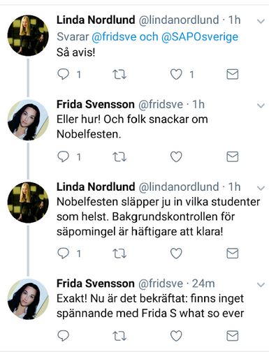 För dem som inte känner till namnen nedan – dessa föreställer crème de la crème av den svenska journalistkåren. ”Undersökande reportrar” på SvD Frida Svensson och Negra Efendic, ledarskribent på Expressen (som ofta dyker upp i försvarsdebatter på SVT) Linda Nordlund och ledarskribenten på Aftonbladet Oisin Cantwell:
