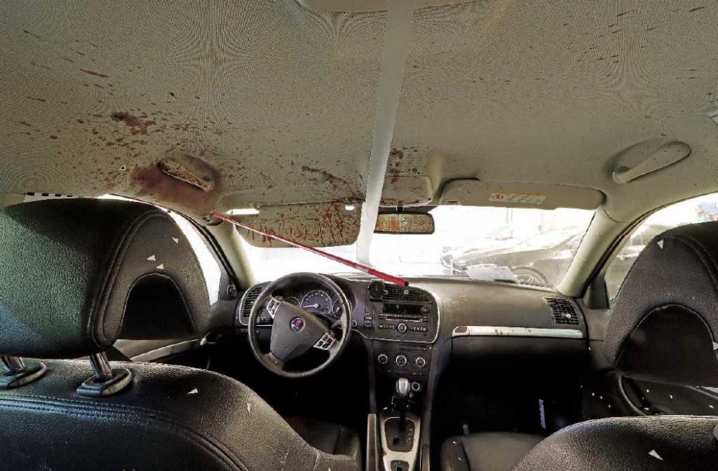 Offrets bil med stänk av blod och hjärnsubstans i taket. Bild: Polisen.