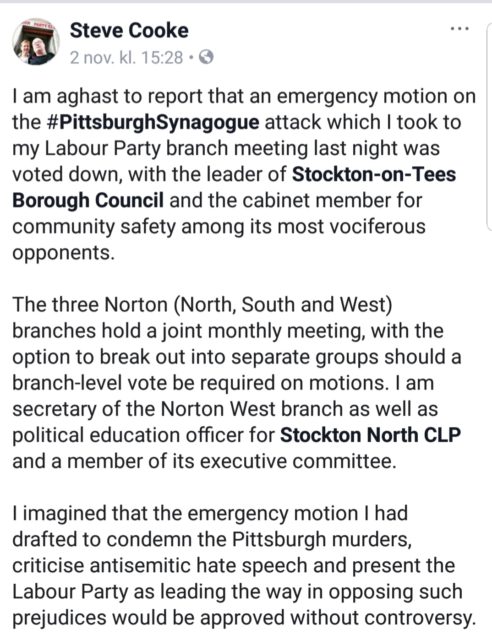 Efter den antisemitiska attacken i Pittsburgh som lämnade 11 personer döda presenterade Steve Cooke, sekreterare för Labours lokalavdelning Norton West, ett förslag om att fördöma attacken. Förslaget uttryckte att avdelningen skulle ”erkänna att antisemitism existerar i vårt samhälle och att attacken visar att antisemitismen växer internationellt”, att ”vi ska bekämpa antisemitismen oavsett var den växer fram” och att ”vi står solidariskt med judiska församlingar världen över”, rapporterar Independent.