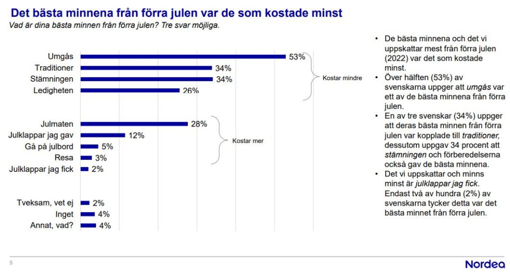 Enligt en undersökning som Verian utfört på uppdrag av Nordea har den tuffa ekonomiska situationen gjort att många fått dra ned på julfirandet, bara en liten andel kommer fira precis som vanligt. Samtidigt är det man värdesätter mest det som kostade minst.