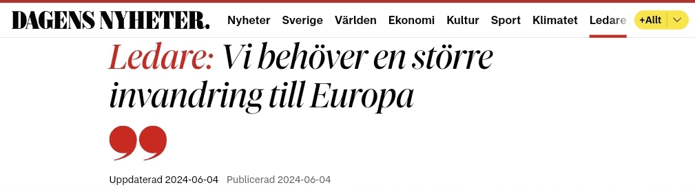 Inför EU-valet som står för dörren har Dagens Nyheter publicerat en osignerad ledare i vilken redaktionen kritiserar svenska partier som kampanjar för att stoppa invandringen. Den vänsterliberala tidningen framför att vi i själva verket ”akut” behöver mer invandring.