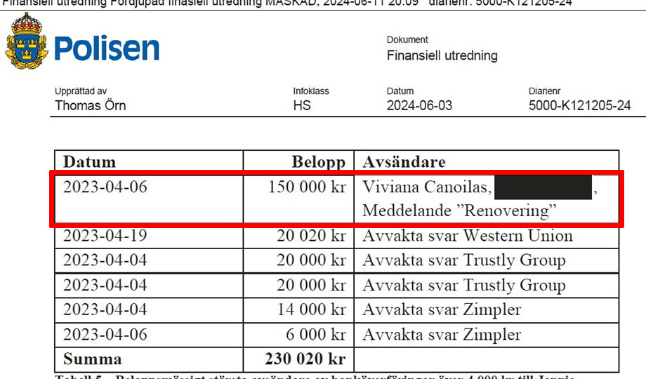 ”Tre och fyra dagar efter inbetalningen från Viviana Canoilas med 150 000 kr går lika mycket pengar ut från kontot i transaktioner som inte går att koppla till någon renovering”, skriver polisen som kommentar till transsaktionen. Kommentaren fortsätter: