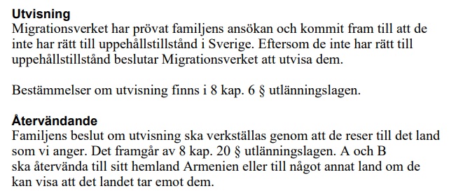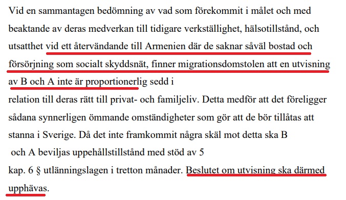 Eftersom paret saknar bostad i Armenien och har dålig hälsa beslutar till sist en enig migrationsdomstol att paret ska få stanna med hänvisning till ”synnerligen ömmande omständigheter”. I domen står det att läsa följande: