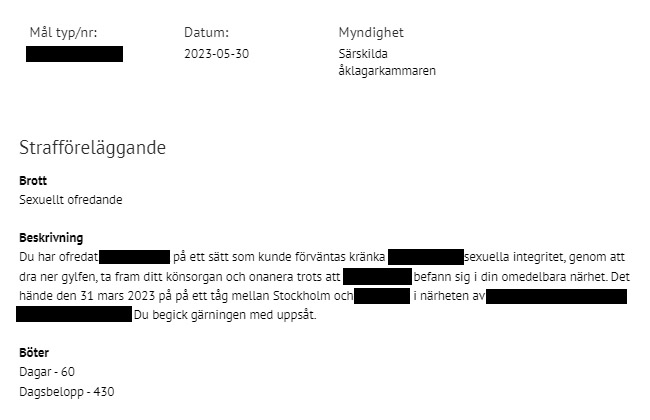 När tåget nästan kommit fram till slutdestinationen sexofredar tingsfiskalen en några år yngre kvinnlig medpassagerare genom att dra ned gylfen, ta fram könsorganet och onanera. Allt enligt ett strafföreläggande från Särskilda åklagarkammaren som mannen två månader senare, den 30 maj, godkänner.