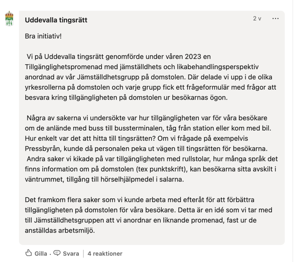 I kommentarsfältet på Linkedin får man ryggdunkar från bland annat anställda på Uddevalla tingsrätt, där man samtidigt stoltserar med att redan för halvannat år sedan genomförde något liknande. Kärt barn har många namn och då kallade man initiativet för ”tillgänglighetspromenad med jämställdhets- och likabehandlingsperspektiv”.