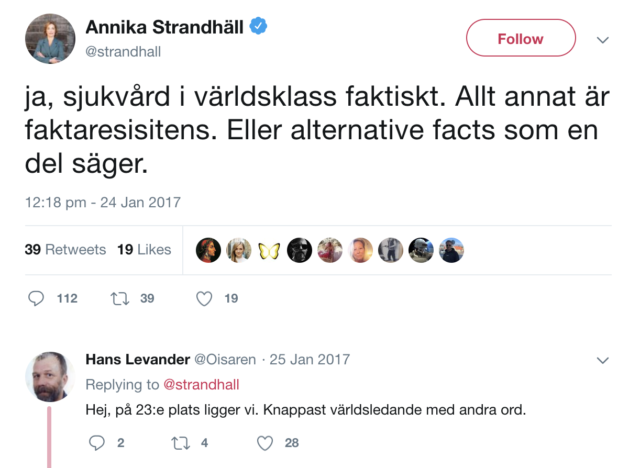 För två år sedan proklamerade Socialförsäkringsminister Annika Strandhäll att Sverige har ”sjukvård i världsklass faktiskt” och hävdade vidare att: ”Allt annat är faktaresistens. Eller alternative facts som en del säger”.
