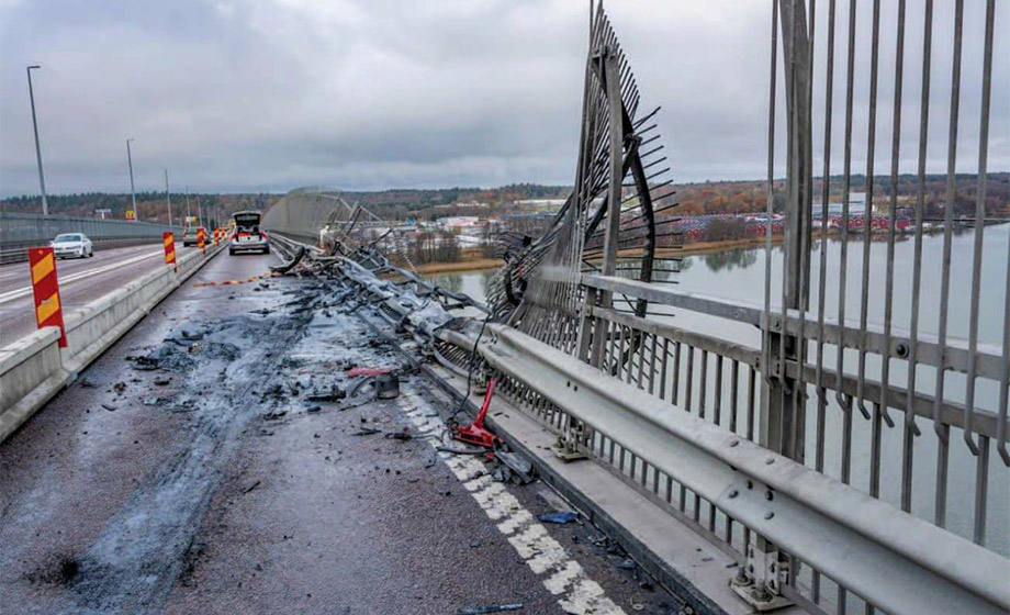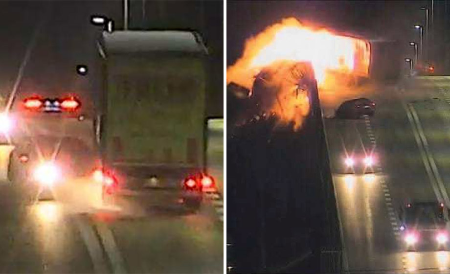 Kollisionen med broräcket gör att lastbilens dieseltankar slås sönder, och ett moln av diesel skapas som antänds. En kraftig brand utbryter i lastbilen i vilken lastbilschauffören omkommer. Lastbilen förblir dock hängandes på brokanten.