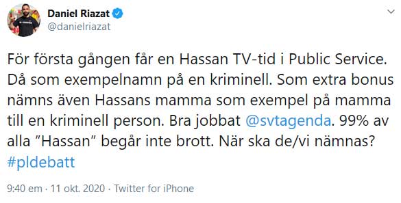 Som Samhällsnytt rapporterat under dagen lämnar SVT:s utrikeskorrespondent Agenda-redaktionen efter kritik från Vänsterpartiet mot att namnet ”Hassan” använts som exempel på en gängkriminell yngling i ett ’utsatt’ invandrarområde. Statistik visar dock att det finns fog för namnvalet framför exempelvis ”Lisa” och ”Kajsa” som föreslagits som alternativ.