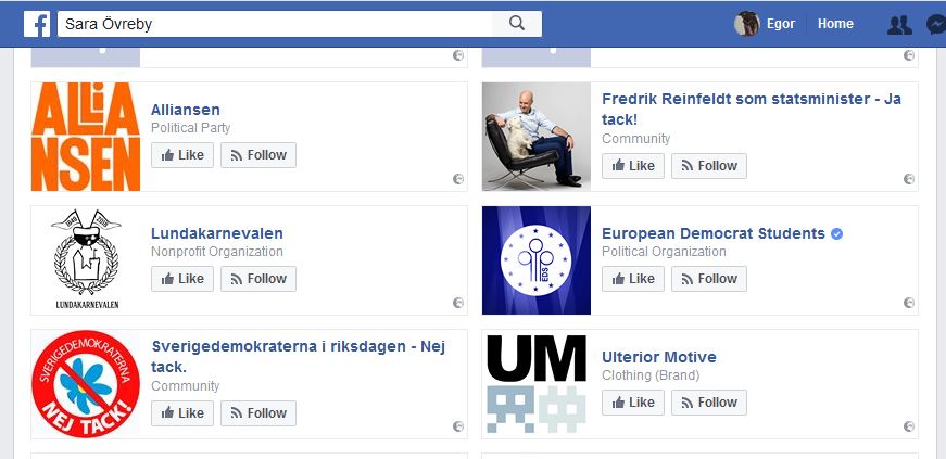 Hon gillar även Annie Lööf, Hillary Clinton och Sweden against Brexit. Övreby har inte svarat på våra frågor som vi ställt via mejl.