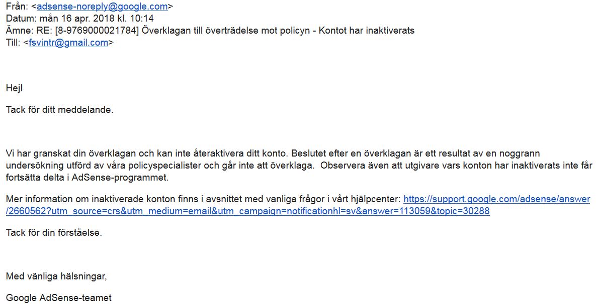 Det gör vi också, men som svar får vi några dagar senare ett meddelande om att hela vårt konto på AdSense är permanent avstängt. Överklagan resulterar i att beslutet kvarstår. Ingen motivering till avstängningen ges: