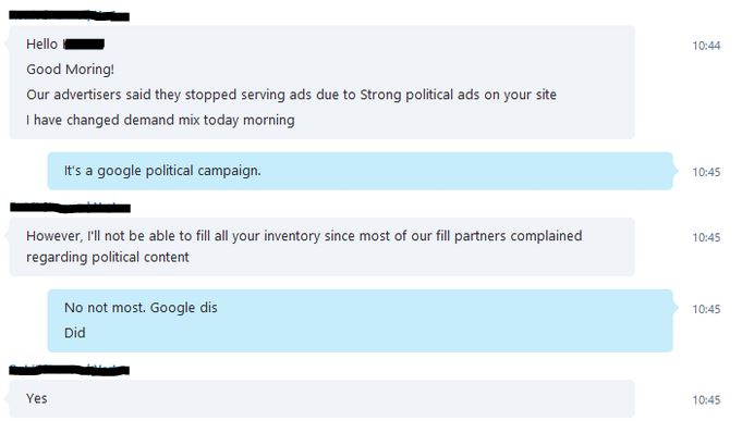 Kort efter bytet får vi dock ett meddelande från det nya nätverkets personal som informerar oss om att även annonserna i GoogleAdX stängs av för oss på grund av ”starkt politiskt innehåll”: