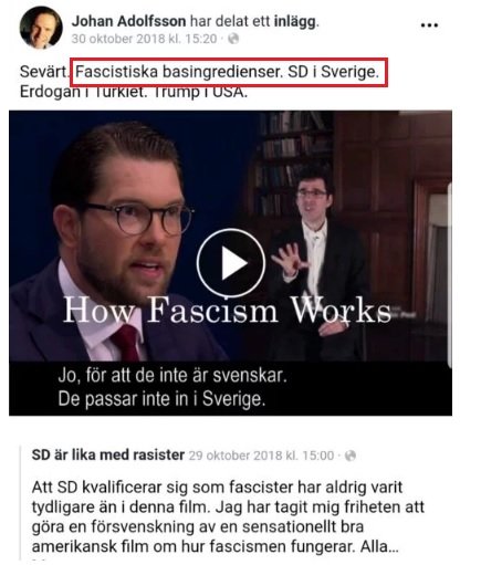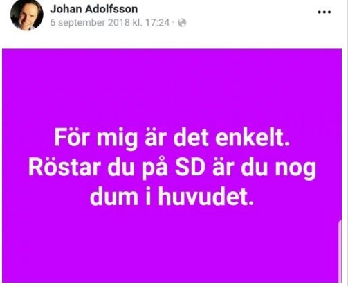 När vi nätgranskade Adolfsson visade han sig vara en passionerad SD-hatare. Bland annat skrev han, ”röstar du på SD är du nog dum i huvudet” och jämförde partiledaren Jimmie Åkesson och partisekreteraren Richard Jomshof med Adolf Hitler.