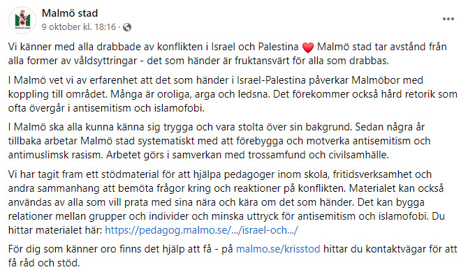 Det föranledde att Malmö stad, dagen därpå, skrev ett inlägg på Facebook för att markera mot ”antisemitism och islamofobi” och om att ”förebygga och motverka antisemitism och antimuslimsk rasism”.