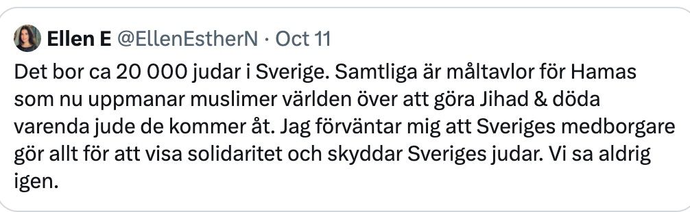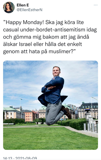 Jag svarade i en tweet om det som jag upplever som stort hyckleri, eftersom Ellen tagit aktiv ställning mot det enda parti (SD) som varnade för importerad antisemitism och som vill stoppa massinvandringen av folk med sådana åsikter. Det var för mycket för Ellen som då blockade mig på Twitter, trots att jag höll god ton och uttryckte empati för den utsatthet som judar i Sverige idag allt mer lider av.