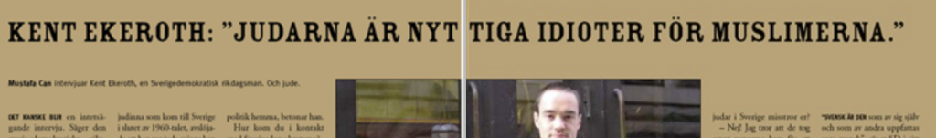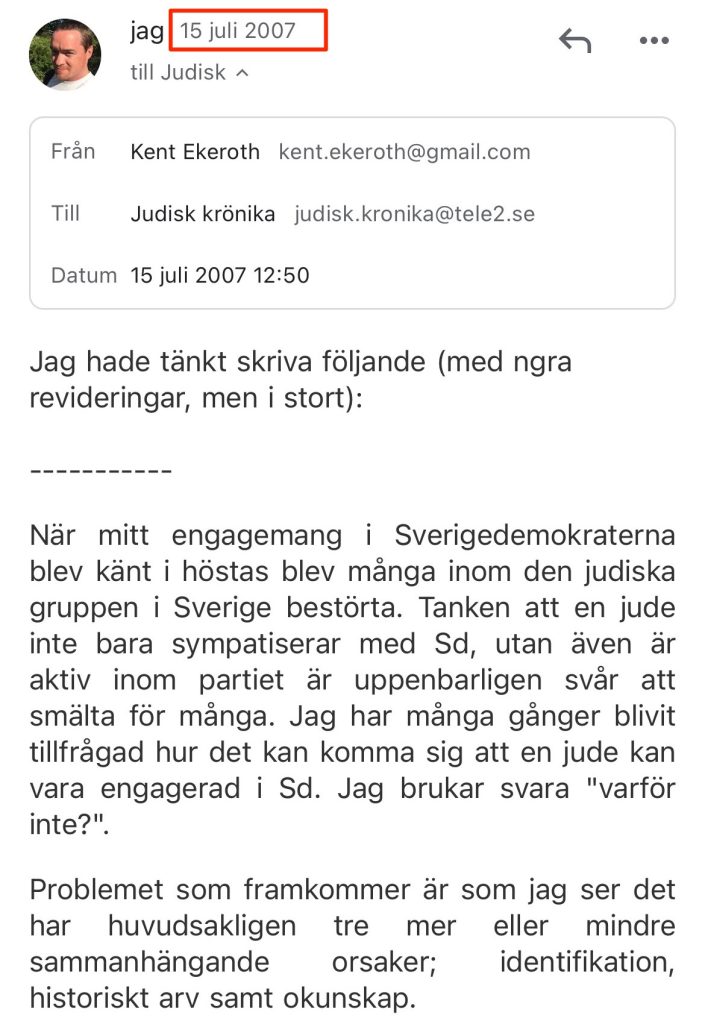 Istället för att låta mig publiceras med mina egna ord i Judisk Krönika valde de att göra en intervju tre år senare. Det är ju lättare att kontrollera narrativet då och vinkla efter behag. Jag gick med på den i brist på andra alternativ. Även om vi precis kommit in i Riksdagen hade SD väldigt få möjligheter att komma till tals.