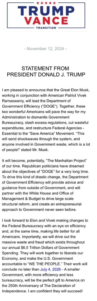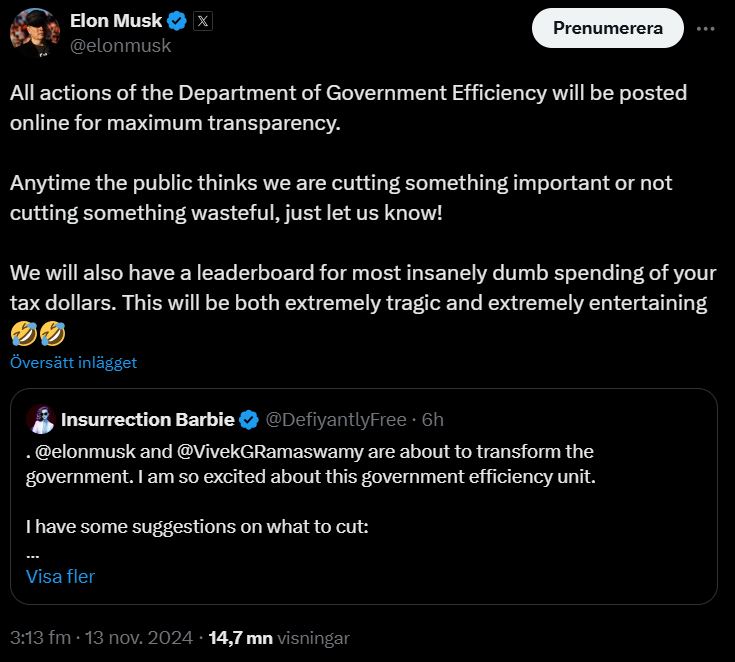 Precis som det spekulerats i innan valet får Elon Musk en roll i Donald Trumps nya administration som tar över styret av USA i januari. Tillsammans med Vivek Ramaswamy kommer han att arbeta med en effektiviseringskommission för att skära ned på onödiga statliga utgifter och utlovar kraftiga förändringar.