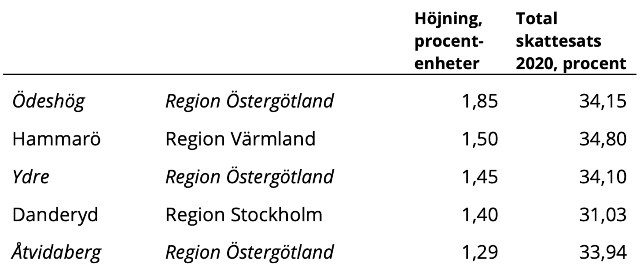 Högsta höjningen sker i Ödeshög där invånarna kommer få betala 1,85 procentenheter med i skatt, tätt följt av Hammarö och Ydre med 1,5 respektive 1,45 procentenheter i höjning.