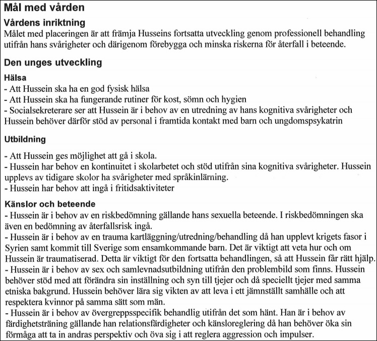 Socialtjänsten i Vetlanda skriver att Husseins föräldrar brister i deras roll som vårdnadshavare. Orsaken är att de helt förnekat Husseins sexbrott mot flickan. Deras sätt att förhålla sig och agera bidrar inte till att hjälpa Hussein från att begå brott, framförallt sexualbrott, igen.