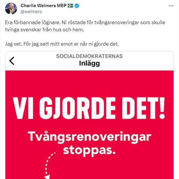 Sverigedemokraterna anklagar Socialdemokraterna att ljuga om att vara motståndare till så kallade tvångsrenoveringar av villor. ”Era förbannade lögnare”, skriver partiets EU-parlamentariker Charlie Weimers på plattformen X.