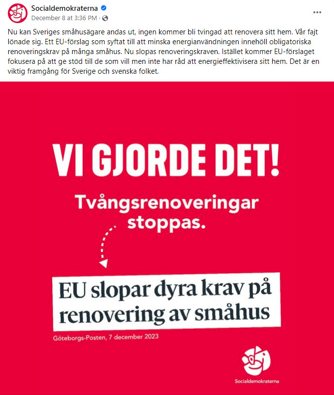 ”Nu kan Sveriges småhusägare andas ut, ingen kommer bli tvingad att renovera sitt hem. Vår fajt lönade sig. Ett EU-förslag som syftat till att minska energianvändningen innehöll obligatoriska renoveringskrav på många småhus”, skrev partiet på bland annat Facebook.