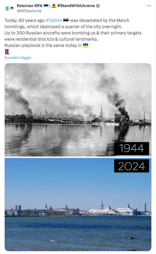 ”Idag, för 80 år sedan, ödelades Tallinn av marsbombningarna, vilka över en natt förstörde en fjärdedel av staden. Upp till 300 ryska flygplan bombade oss och deras främsta mål var bostadsområden och kulturella minnesmärken”, skriver departementet med ett tillägg om att Ryssland agerar likadant i Ukraina idag.