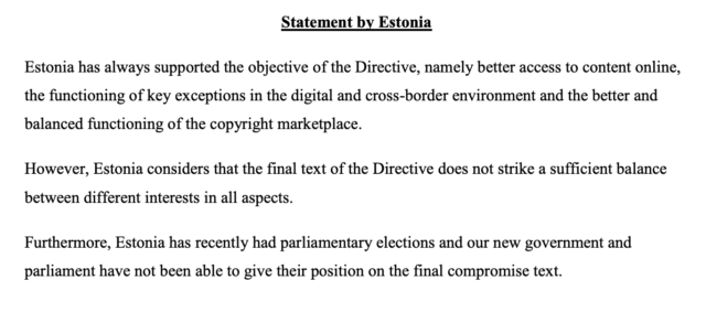 Estland tvekar På torsdagen yttrade sig Estland skeptiskt till direktivet som man anser brister i balans. Landet hänvisar till att det nyligen har varit val vilket gjort att parlamentet ännu inte tagit beslut om en position.