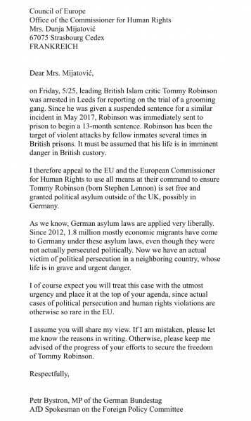 “Robinson har vid flera tillfällen varit måltavla för våldsamma attacker från andra fångar i brittiska fängelser. Det måste antas att hans liv är i omedelbar fara i brittiskt fängsligt förvar. Jag vädjar därför till EU och Europarådets kommission för mänskliga rättigheter att använda alla till buds stående medel för att se till att Tommy Robinson (född Stephen Lennon) släpss fri och beviljas politisk asyl utanför Storbritannien, eventuellt i Tyskland.”.