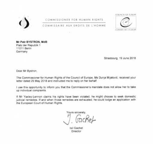 Nu sällar sig även Europakommissionen för mänskliga rättigheter genom kommissionär Dunja Mijatović till dem som vänder Tommy Robinson ryggen. Beskedet kom efter att den tyske parlamentsledamoten Petr Bystron skrivit till kommissionen och krävt att man bistår Robinson i hans önskan att söka asyl utanför Storbritannien.
