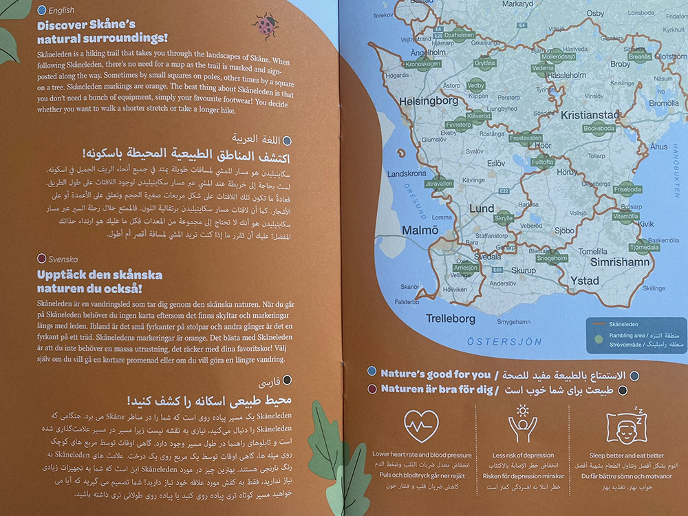 En broschyr på bland annat arabiska och persiska som nyligen skickats ut till 110 000 skånska hushåll ska locka ut fler i naturen. Det hoppas i alla fall Region Skåne.