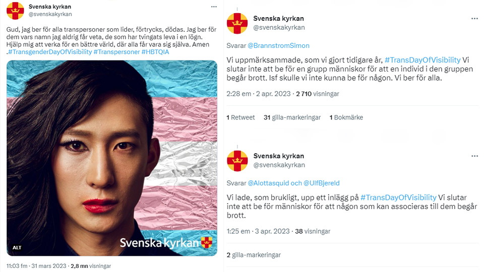 Samnytt har två frågor till Svenska kyrkan: Den ena är varför man valde att uppmärksamma Transgender day of visibility just förra veckan, då det inte gjorts på samma sätt tidigare. Den andra gäller hur Svenska kyrkan använder sociala medier och reaktioner på det användandet.