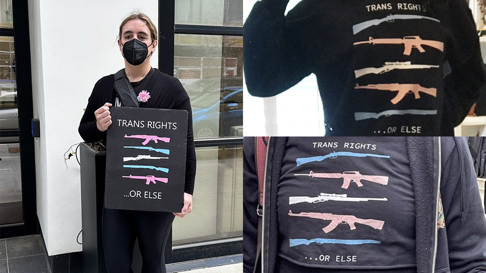 Bland annat hålls en skylt med budskapet ”Trans rights …or else” upp, dekorerad med vapen färgade i samma kulörer som den transsexuella rörelsens flagga. T-shirtar med liknande tryck har fått allt större spridning från 2019 och framåt.