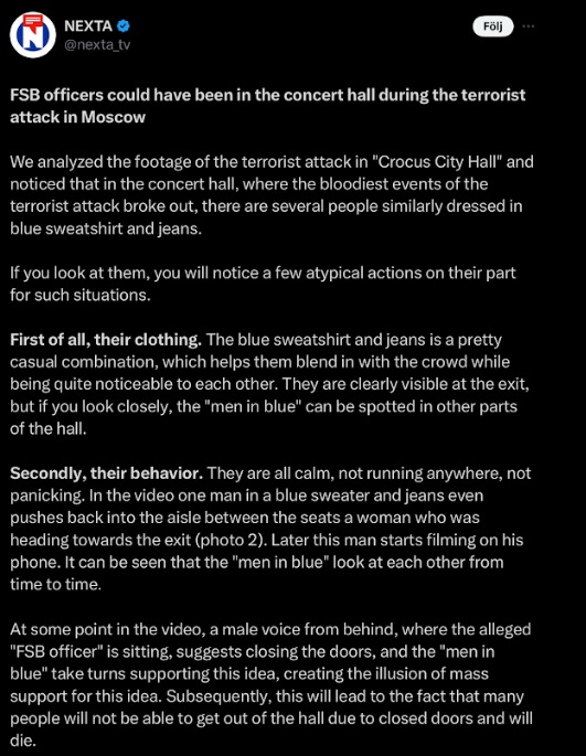 ”Flera män med blå tröjor och jeans fanns på plats under massakern i Crocus konserthall i Moskva. Deras lugna uppträdanden sticker av mot resten av de panikslagna besökarnas när automatelden börjar smattra – och östeuropeiska nyhetsförmedlaren Nexta menar att det kan röra sig om FSB-agenter.”