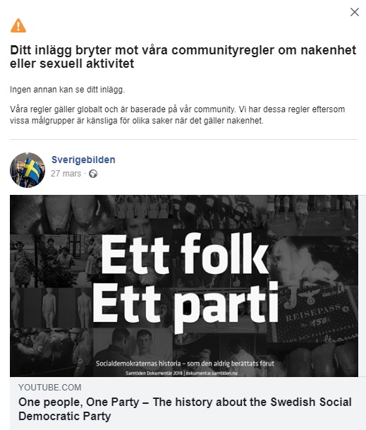 Den senaste veckan har skärmdumpar börjat cirkulera i sociala medier som visar hur användare på Facebook har fått delningslänkar från YouTube till dokumentären ”Ett folk, ett parti – Socialdemokraternas historia” bortplockade. Enligt samma uppgifter straffar Facebook även användare som delar materialet genom att stänga av dem i en vecka.