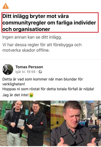 Som anledning till sanktionerna tydliggör Facebook att inläggen ”bryter mot våra communityregler om farliga individer och organisationer”.
